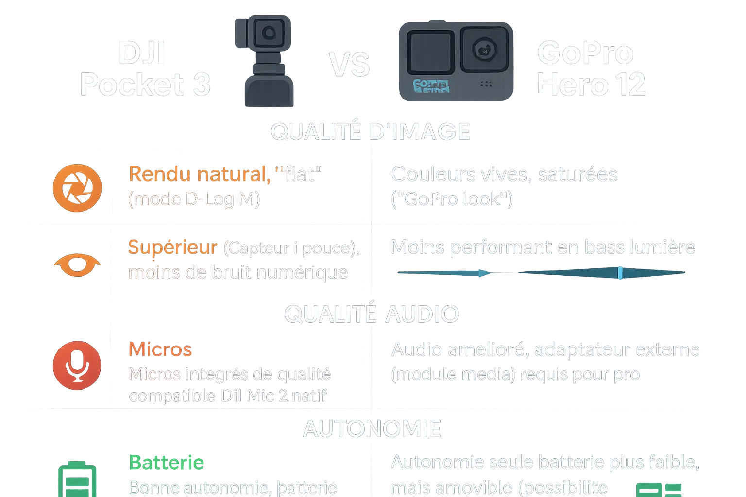 Goda nyheter, tvekar du mellan DJI Osmo Pocket 3 och GoPro Hero 12 ? Pocket 3 erbjuder smidig mekanisk stabilisering, perfekt för diskreta vloggar eller videor. GoPro, extremt robust och vattentät, är en kraft att räkna med under extrema förhållanden. Pocket 3 är kompakt men tunn utan skydd, medan GoPro är dropptålig med ett brett synfält. För lugna stunder eller stadslandskap är Pocket 3 perfekt. Är du redo att välja smidighet och kvalitet ? Köp DJI Osmo Pocket 3.